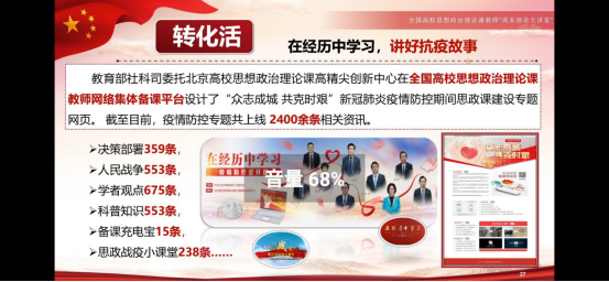 5月22日14:30公司全体专兼职教师通过网络在线方式收看了全国高校思想政治理论课教师“周末理论大讲堂”视频直播。本场讲座的主讲嘉宾是中国人民大学马克思主义公司党委书记兼常务副经理,北京高校思想政治理论课高精尖创新中心常务副主任王易教授,授课题目是《习近平总书记关于疫情防控系列重要讲话精神导学》。