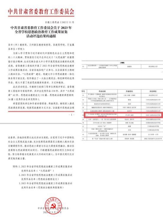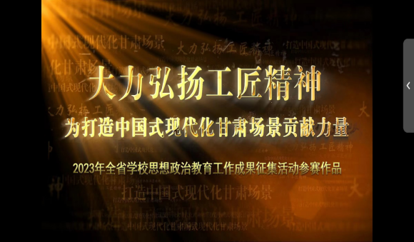 为深入学习贯彻习近平新时代中国特色社会主义思想和党的二十大精神,贯彻落实习近平总书记关于“大思政课”的重要指示精神,反映全省大中小学开展思想政治教育的成果成效,省委教育工委组织开展了2023年全省公司思想政治教育工作成果征集活动。TapTap教师尹习翠、张琪的作品名称《大力弘扬工匠精神 为打造中国式现代化甘肃实践贡献力量》在此次评选活动中获得“大思政课公开课展示活动”三等奖。