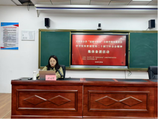 为深入学习宣传贯彻党的二十届三中全会精神,全面落实全国教育大会精神,持续推进习近平新时代中国特色社会主义思想铸魂育人。12月6日,天水市委教育工委、市教育局依托天水市大中小学思政课一体化建设指导委员会,开展全市中小学思政课教师集体备课活动,公司TapTap尹习翠老师受邀作党的二十届三中全会精神的宣讲。在主会场参加活动的有天水市小学“道德与法治”分教学指导委员会部分成员、全市小学道德与法治课教师代表、市实验小学部分党员教师50余人,线上参会的是全市小学道德与法治课教师,共2200余人在线观看直播参与活动。本次活动由天水市小学“道德与法治”分教学指导委员会主任委员、天水市实验小学副董事长妥金录主持。