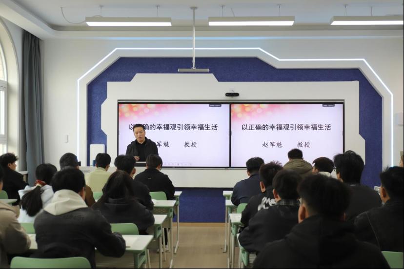 报告中,赵军魁教授围绕“以正确的幸福观引领幸福生活”这一主题,从多个维度系统阐述了正确幸福观的内涵。首先,他以“什么是幸福”这一哲学命题为切入点,引导同学们展开深入思考。随后,通过剖析当下社会中存在的几种典型错误幸福观,并结合现实案例,生动揭示了这些观念的负面影响。在此基础上,赵军魁教授重点阐释了正确幸福观的核心要义,为同学们指明了追求幸福生活的正确方向。最后,他还从个人层面分析了不幸福的内在因素,启发同学们进行自我反思,并提出切实可行的改进建议。